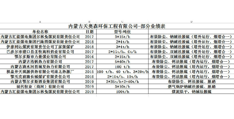 內蒙古天奧森環保工程有限公司-部分業績表