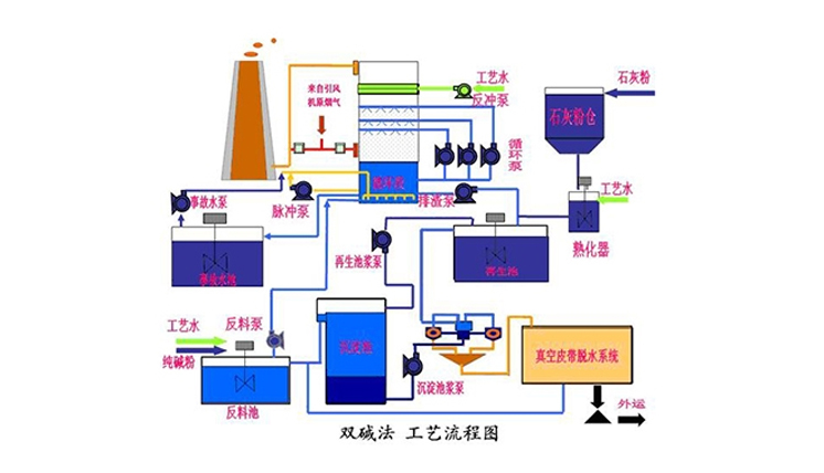 雙堿法是采用鈉基脫硫劑進行塔內脫硫,由于鈉基脫硫劑堿性強,吸收二氧化硫后反應產物溶解度大,不會造成過飽和結晶,造成結垢堵塞問題。另一方面脫硫產物被排入再生池內用氫氧化鈣進行還原再生,再生出的鈉基脫硫劑再被打回脫硫塔循環使用。雙堿法脫硫工藝降低了投資及運行費用,比較適用于中小型鍋爐進行脫硫改造。